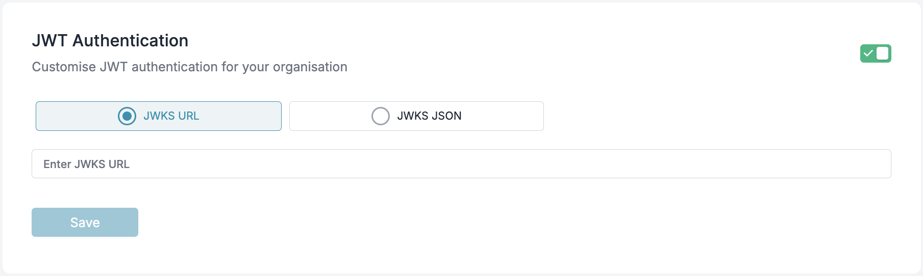 To validate JWTs, you must configure one of the following:- JWKS URL: A URL from which the public keys will be dynamically fetched.