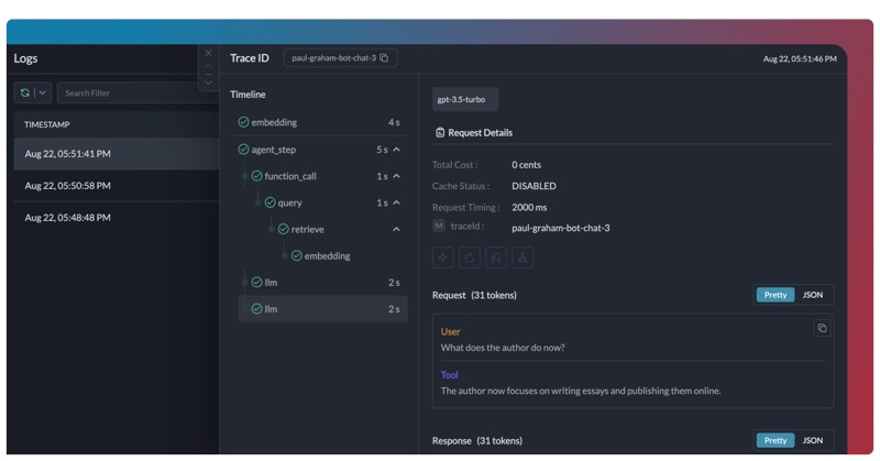 Each log entry provides useful data such as the timestamp, request type, LLM used, tokens generated, thinking tokens and cost. For multimodal models, Logs will also show the image sent with vision/image models, as well as the image generated. By clicking on an entry, a side panel opens up, revealing the entire raw data with the request and response objects. This detailed log can be invaluable when troubleshooting issues or understanding specific interactions. It provides full transparency into each request and response, enabling you to see exactly what data was sent and received.
