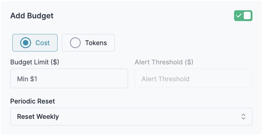 • Budget limits can be set as either cost-based (USD) or token-based