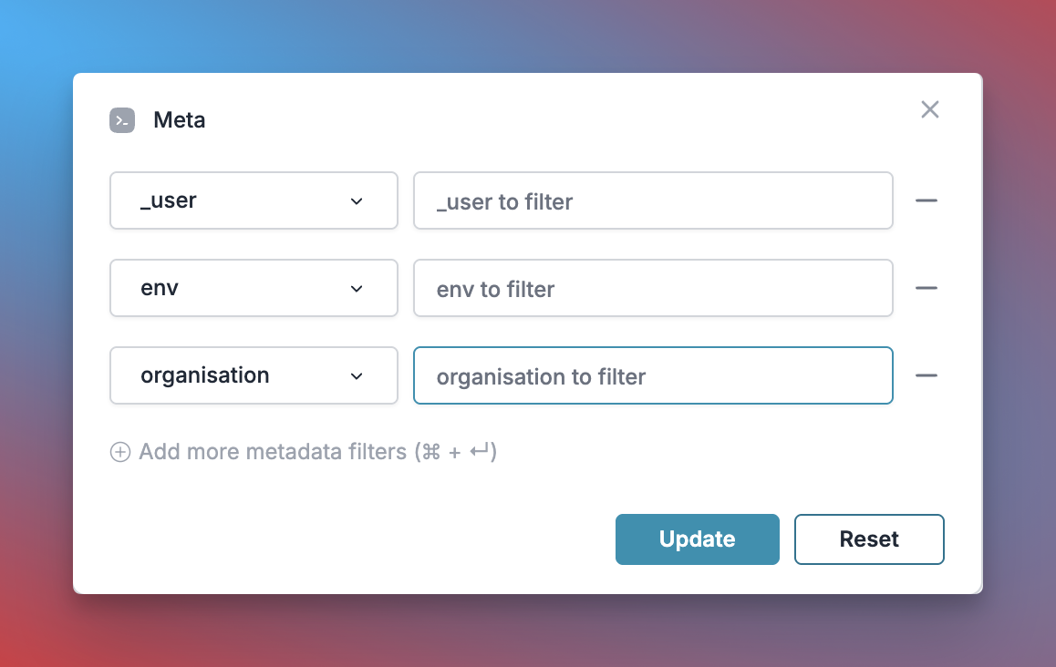 You can also apply any metadata filters to the logs or analytics and filter data by any metadata key you’ve used: